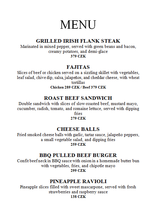 Připravili jsme si pro vás Speciální menu. Ochutnat ho můžete vždy ve všední dny od 15 hodin o víkendech od 12 hodin společně se stálou nabídkou. Prosíme, vytvořte si rezervaci.
