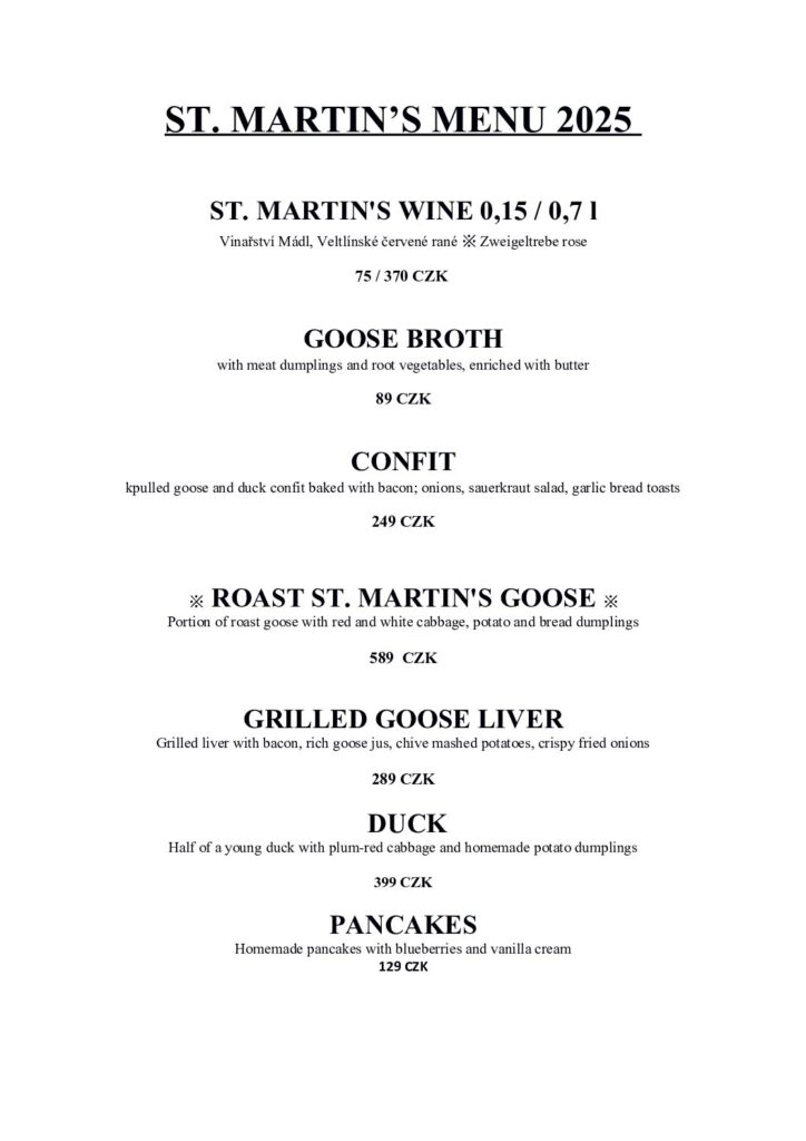 St. Martin’s Feast is coming! Come and enjoy the great atmosphere and taste our special menu: roasted goose, duck, confit, kaldoun soup, tender liver, and sweet pancakes! And of course, everything will be perfectly complemented by St. Martin’s wine, and on November 8th from 7:00 PM, we’ll be joined by Štěpán Hanuš’s cimbalom band for some wonderful live music.